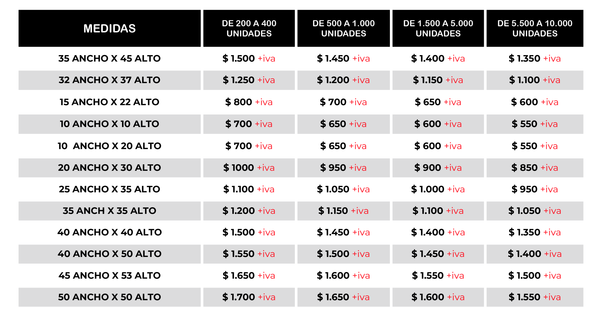 | Colores | ROJO, VERDE MANZANA, NEGRO, NARANJA, VERDE CALI, AZUL OSCURO, AZUL ACUEDUCTO, BLANCO, BEIGE, ROSADO, MARFIL, AZUL REY, LILA, FUCSIA, AZUL BEBÉ, AMARILLO, TURQUESA, VERDE JADE, MORADO, VINO TINTO, GRIS RATÓN, VERDE MILITAR, CAFÉ |